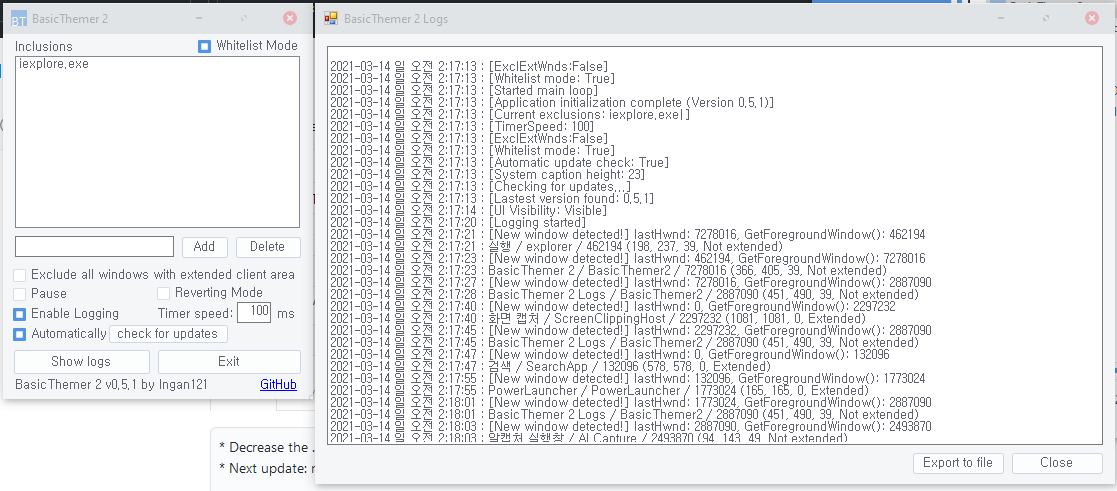 - Exclusions list and the 'Exclude all windows with extended client area' checkbox will be saved.