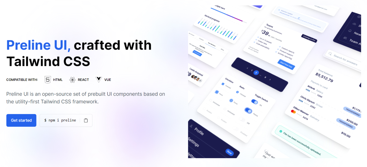 Based on the Tailwind CSS utility classes, Preline UI's prebuilt components and UI elements help you quickly design and customize responsive mobile-first websites with the components a website needs, including buttons, dropdowns, navigation bars, modals, and more.