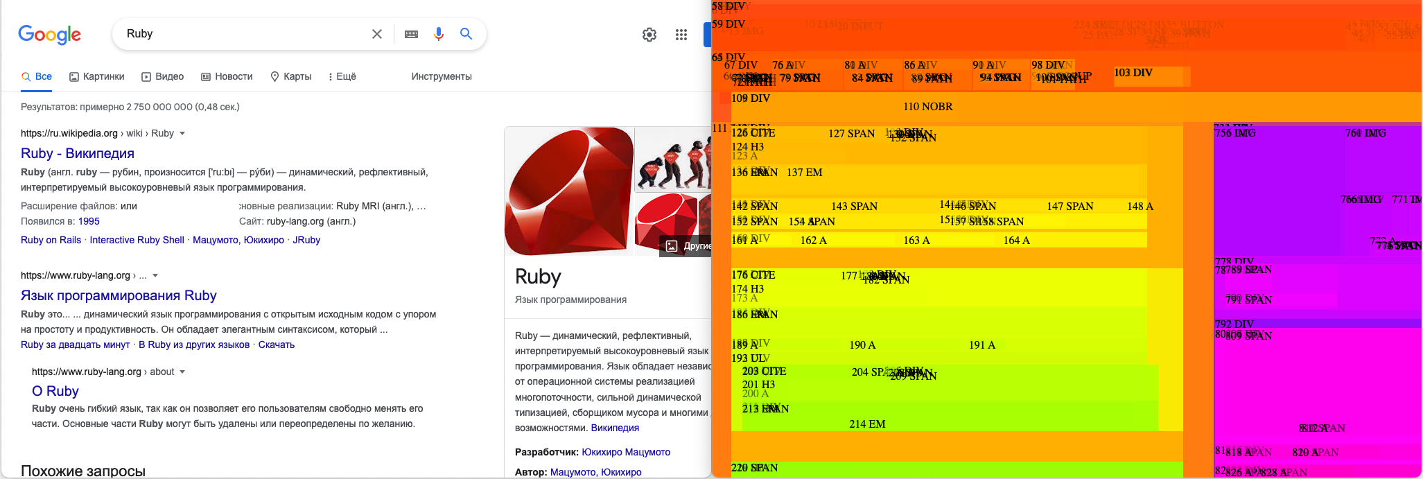 The Google Search page is complex today and as you can see with the default options it did not recognize the first result and misrecognized others. The misrecognized ones either have no blue hyperlinks or no text at all. What can we do? Each recognized node has a method #texts that allows us to access the text blocks and their style. It also recognizes text color classifying it based on 16 Basic Web colors. Let's use it and add a custom euristic that would give a hint to process only such nodes that contain black and blue text: