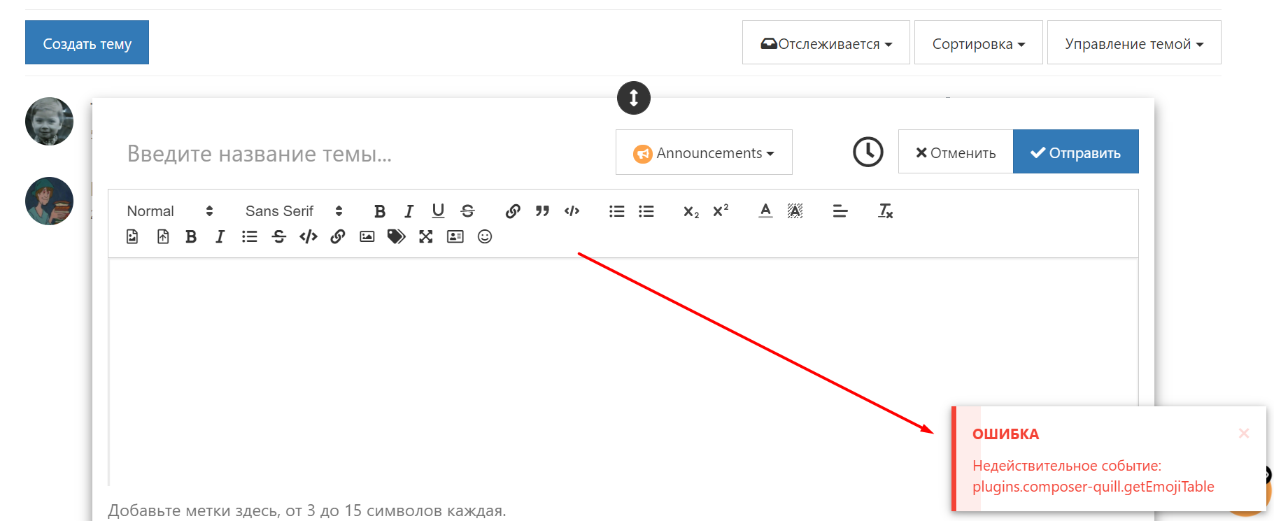 Недействительное событие: plugins.composer-quill.getEmojiTable Invalted event: plugins.composer-quill.getEmojiTable  NodeBB 1.18.0 Default installation