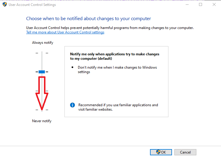 - Also you need to disable the notifications prompt when you try to open a program that requires Admin permission Go to start and type "Change User Account Control settings", open it and slide down to "Never notifiy"