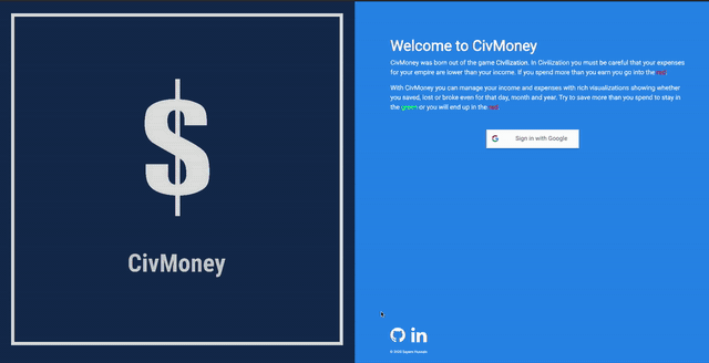 With CivMoney you can manage your income and expenses with rich visualizations showing whether you saved, lost or broke even for that day, month and year. Try to save more than you spend to stay in the green or you will end up in the red.