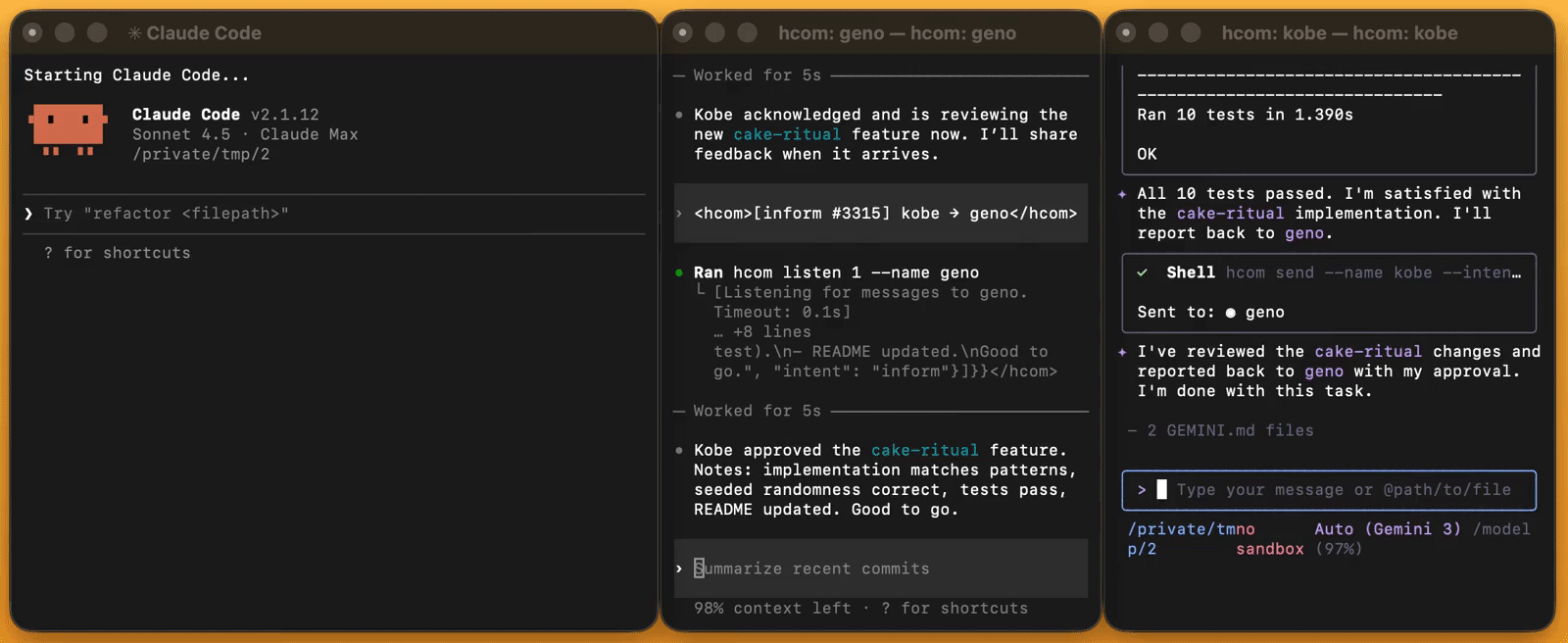 hcom 3 codex # open 3 codex instances> spawn a gemini to write tests for this feature