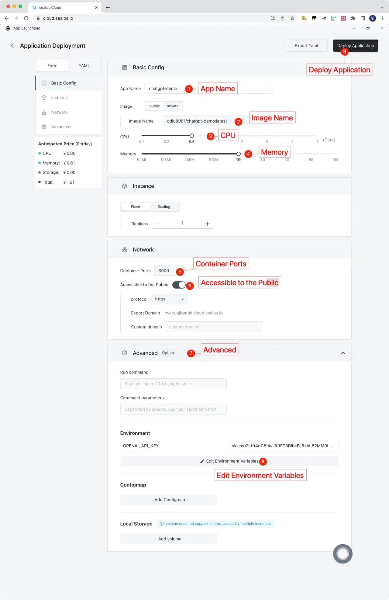 4.Just fill in according to the following figure, and click on it after filling out Deploy Application button