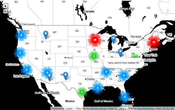 A marker clustering layer for Leaflet maps. Markers are grouped together based on pixel-distance from each other at a particular zoom level. As the map zooms in and out, groups are recomputed. Image assets are base64-encoded into the javascript file, so there's no need to host images/stylesheets.