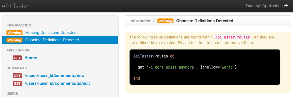 APIs evolve - especially during the development stage. To keep ApiTaster.routes in sync with your route definitions, API Taster provides a warning page that shows you the definitions that are obsolete/mismatched therefore you could correct or remove them.