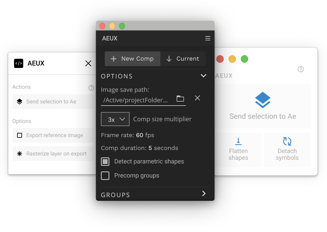 Built on the original After Effects layer transfer system, Sketch2AE, AEUX now supports Catalina updates to Sketch and browser based Figma. UX motion design in Ae has never been easier to get started.