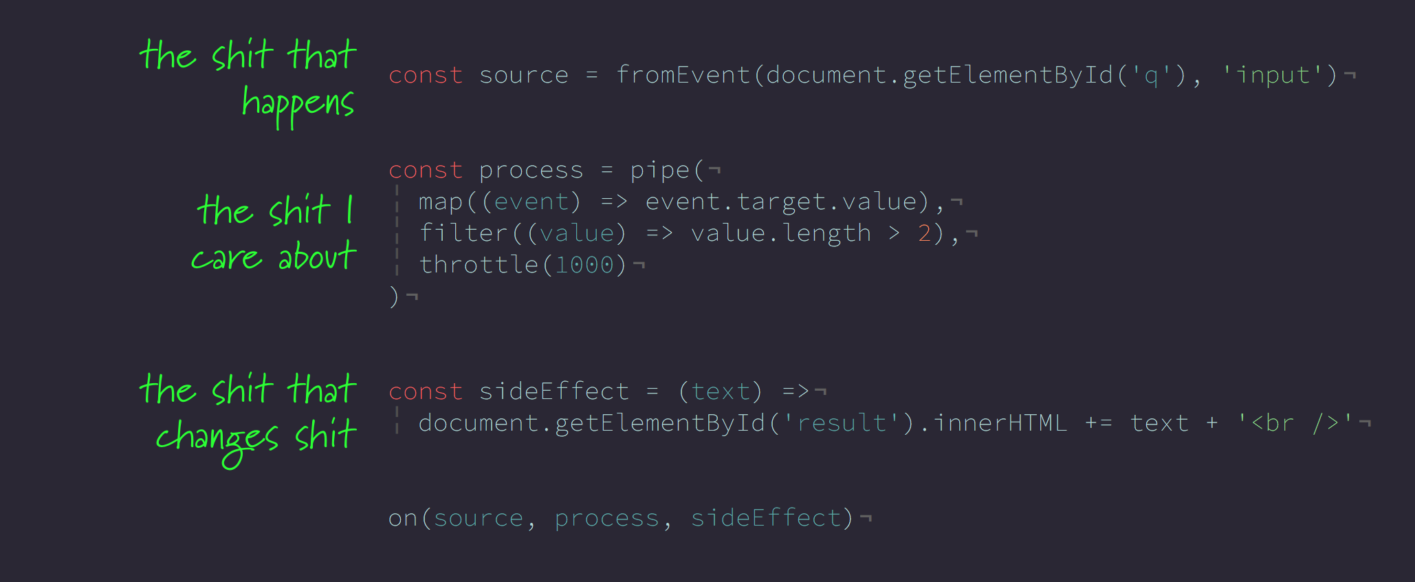 There are many cool things about using a signal library. Depending on who you ask people will give you a different perspective on why it is cool. This is another source of confusion. But the main things you'll hear about are composability, testability and isolation of side effects. People may talk about these things using other terms like expressiveness, purity, reasoning, etc... These are just jargon that eventually boils down to the relevant stuff.