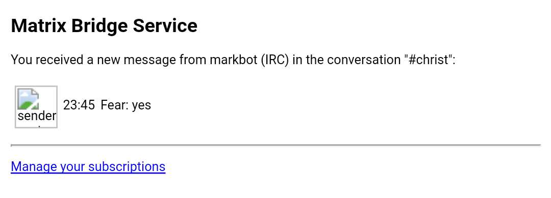 I'm in a room, #_ircnet_#Christ:irc.snt.utwente.nl where there is a relay bot which formats usernames as <username@network>. The email bridge strips these out so the emails don't specify who's speaking in this room. Pretty nonstandard scenario, I understand.