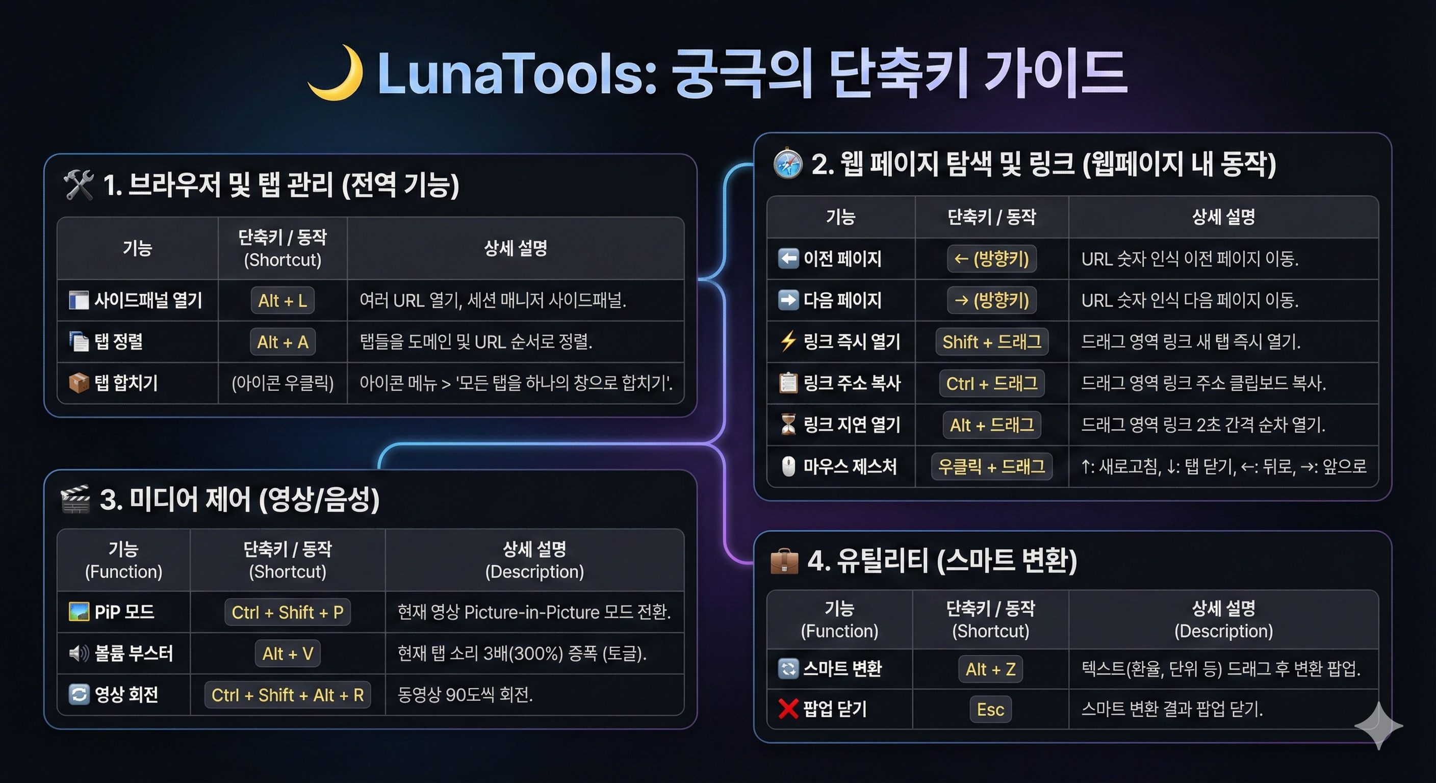 LunaTools - 구글 크롬 확장 프로그램: 마우스 제스처, 좌우키 페이지 이동, 탭 중복 제거/정렬/병합, PiP, 환율/단위/시각 변환, 영상 회전, 사이트 잠금/차단, 드래그 복사/열기,여러 URL 열기, 볼륨 300% 증폭, 세션 매니저, 음소거, 위로가기