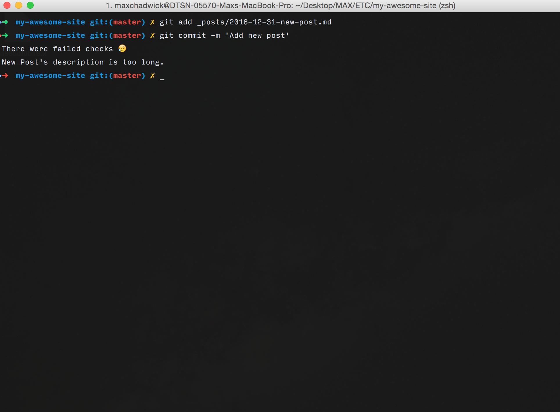 - check: DoesNothingAs you can probably tell by the name, this check doesn't actually do anything. Review the checks in lib/jekyll-pre-commit/checks for some more useful examples.
