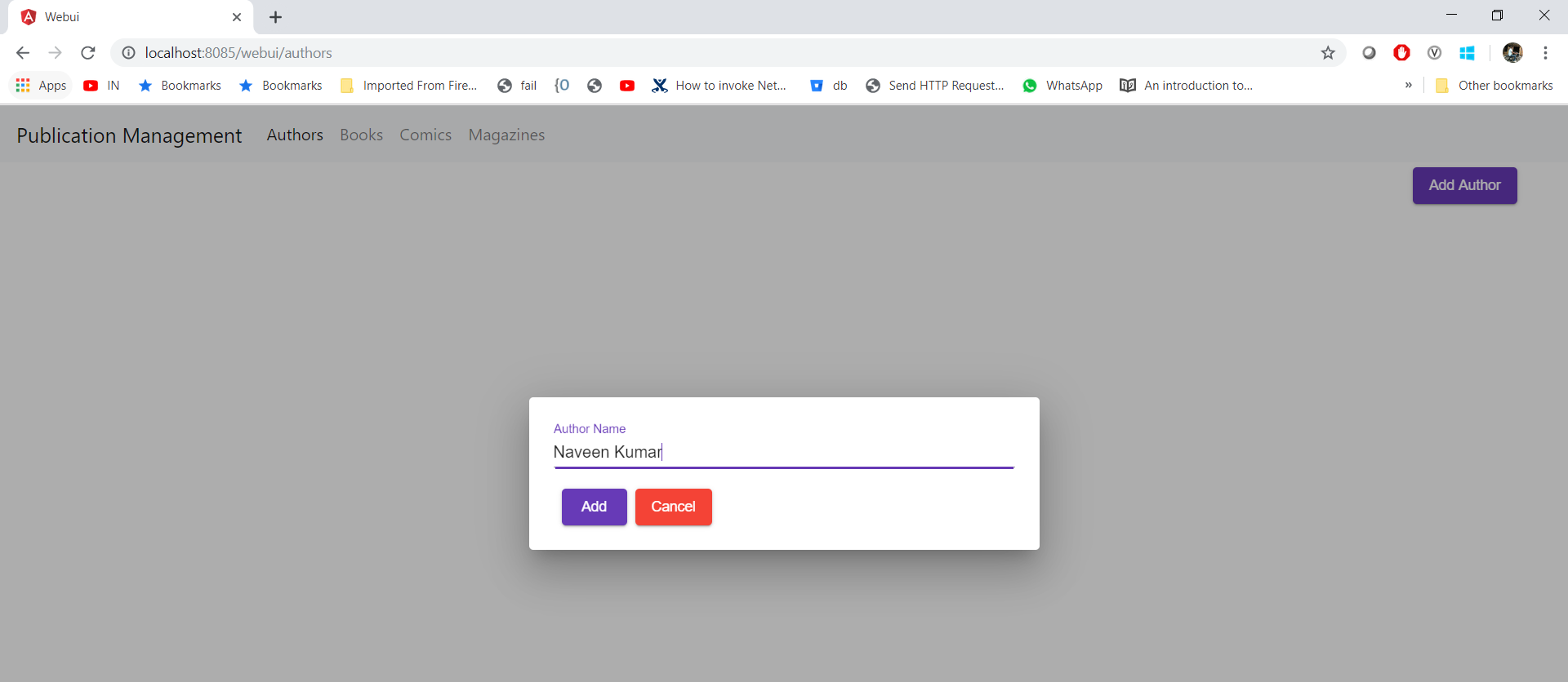 *Angular Web UI project is also bundled with this jar and can be accessed on http://localhost:8085/webui/index.html URI. Listing and addition of book and authors functionality is only working in Web UI developed using angular 7. *