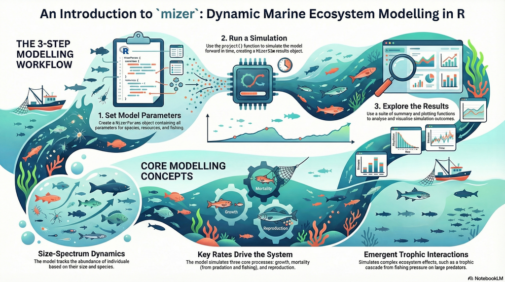 Mizer is an R package to run dynamic multi-species size-spectrum models of fish communities. The package has been developed to model marine ecosystems that are subject to fishing. However, it may also be appropriate for other aquatic ecosystems. By providing a framework for multi-species fisheries modelling as an R package, mizer enhances the accessibility, usability, and reproducibility of models, and thus aims to facilitate collaboration and innovation.