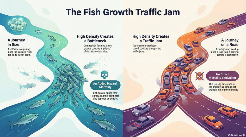 It is interesting to think of the marine ecosystem as a transport system that moves biomass from the size of primary producers (mostly unicellular plankton) up to the sizes of fish that humans like to consume. Each fish that grows up from egg size to maturity by eating smaller individuals is like a car on this biomass highway. The yield of our fisheries depend on this traffic flowing smoothly and without traffic jams.