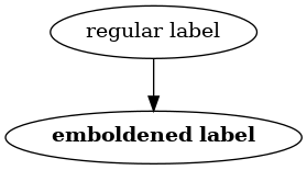 GraphViz supports something called HTML-like labels for some objects. This can be useful for adding some mark-up to edge or node labels (e.g. fractions with <<SUP>1</SUP>/<SUB>2</SUB>2>). A HTML-like label is delimited with a pair of angle brackets instead of double-quotes. E.g.