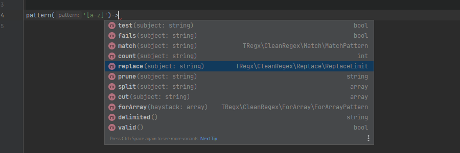 $pattern = Pattern::of("ups"); // pattern("ups") also works $matcher = $pattern->match('yay, ups'); if (!$matcher->test()) { echo "Unmatched subject :/"; } foreach ($matcher as $detail) { $detail->text(); // (string) "ups"; $detail->offset(); // (int) 0 } $pattern->replace('well, ups')->with('heck') // (string) "well, heck";